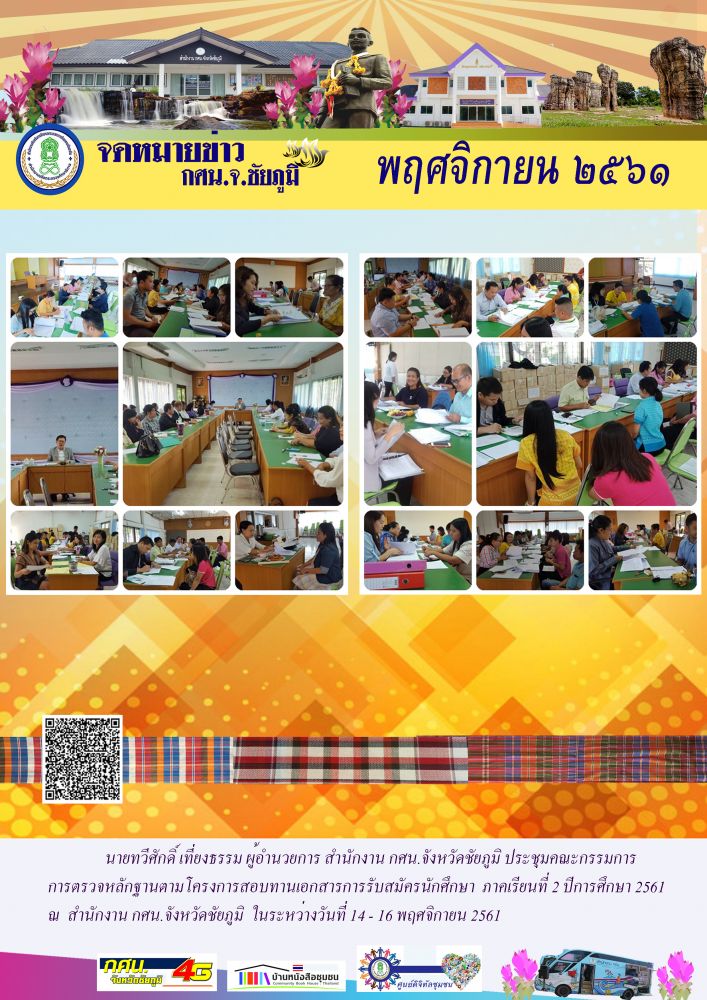 ข่าวประชาสัมพันธ์และกิจกรรม นายทวีศักดิ์ เที่ยงธรรม ผู้อำนวยการ สำนักงาน กศน.จังหวัดชัยภูมิ ประชุมคณะกรรมการ การตรวจหลักฐานตาม โครงการสอบทานเอกสารการรับสมัครนักศึกษา ภาคเรียนที่ 2 ปีการศึกษา 2561ณ สำนักงาน กศน.จังหวัดชัยภูมิ ในระหว่างวันที่ 14 - 16 พฤศจิกายน 256