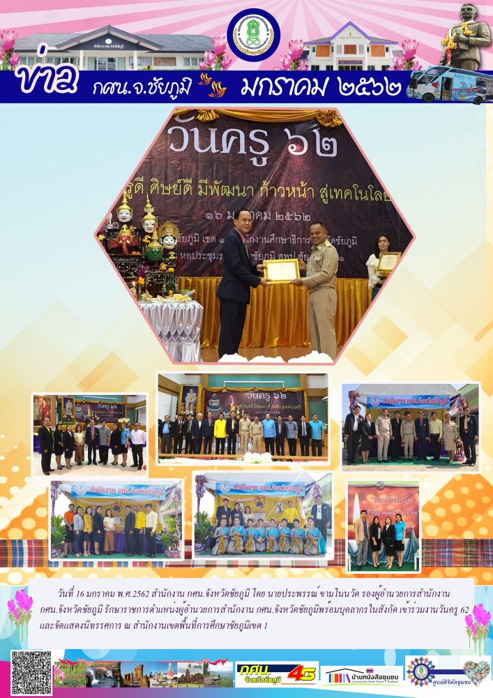 ข่าวประชาสัมพันธ์และกิจกรรม วันที่ 16 มกราคม พ.ศ.2562 สำนักงาน กศน.จังหวัดชัยภูมิ โดย นายประพรรณ์ ขามโนนวัด รองผู้อำนวยการสำนักงาน กศน.จังหวัดชัยภูมิ รักษาราชการตำแหน่งผู้อำนวยการสำนักงาน กศน.จังหวัดชัยภูมิพร้อมบุคลากรในสังกัด เข้าร่วมงานวันครู 62 และจัดแสดงนิทรรศการ ณ สำนักงานเขตพ