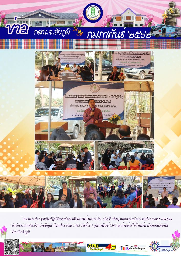 โครงการประชุมเชิงปฎิบัติการพัฒนาศักยภาพด้านการเงิน บัญชี พัสดุ และการบริหารงบประมาณ E-Budget สำนักงาน กศน.จังหวัดชัยภูมิ ปีงบประมาณ 2562 วันที่ 6-7 กุมภาพันธ์ 2562 ณ บ้านต้นไม้รีสอร์ท อำเภอเทพสถิต จังหวัดชัยภูมิ