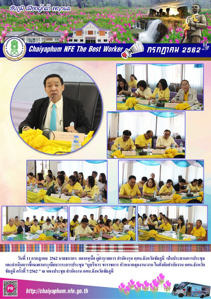 สำนักงาน กศน.จังหวัดชัยภูมิ ครั้งที่ 7/2562 " ณ ห้องประชุม สำนักงาน กศน.จังหวัดชัยภูมิ ////// เอนก รายงาน