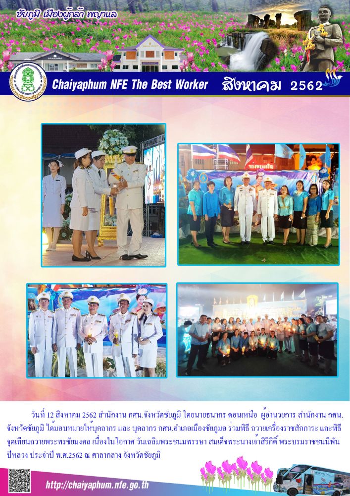 ข่าวประชาสัมพันธ์และกิจกรรม วันที่ 12 สิงหาคม 2562 สำนักงาน กศน.จังหวัดชัยภูมิ โดยนายธนากร ดอนเหนือ ผู้อำนวยการ สำนักงาน กศน.จังหวัดชัยภูมิ ได้มอบหมายให้บุคลากร และ บุคลากร กศน.อำเภอเมืองชัยภูมอ ร่วมพิธี ถวายเครื่องราชสักการะ และพิธีจุดเทียนถวายพระพรชัยมงคล เนื่องในโอกาศวันเฉลิมพระช