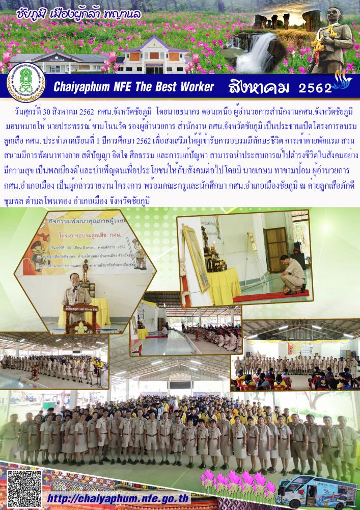 ข่าวประชาสัมพันธ์และกิจกรรม วันศุกร์ที่ 30 สิงหาคม 2562 กศน.จังหวัดชัยภูมิ โดยนายธนากร ดอนเหนือ ผู้อำนวยการสำนักงาน กศน.จังหวัดชัยภูมิ มอบหมายให้ นายประพรรณ์ ขามโนนวัด รองผู้อำนวยการ สำนักงาน กศน.จังหวัดชัยภูมิ เป็นประธานเปิด โครงการอบรมลูกเสือ กศน. ประจำภาคเรียนที่ 1 ปีการศึกษา 256