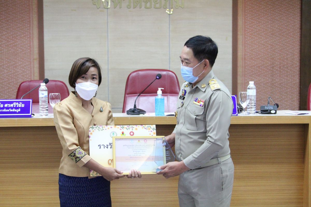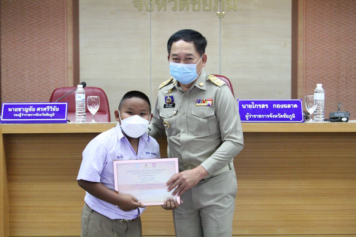 ผู้ว่าราชการจังหวัดชัยภูมิ เป็นผู้มอบโลห์รางวัลให้กับ เด็กหญิงณฐพร เส้นทอง ได้รับรางวัลรองชนะเลิศอันดับที่ 1 เด็กหญิงกานต์ธีรา อาจแก้ว